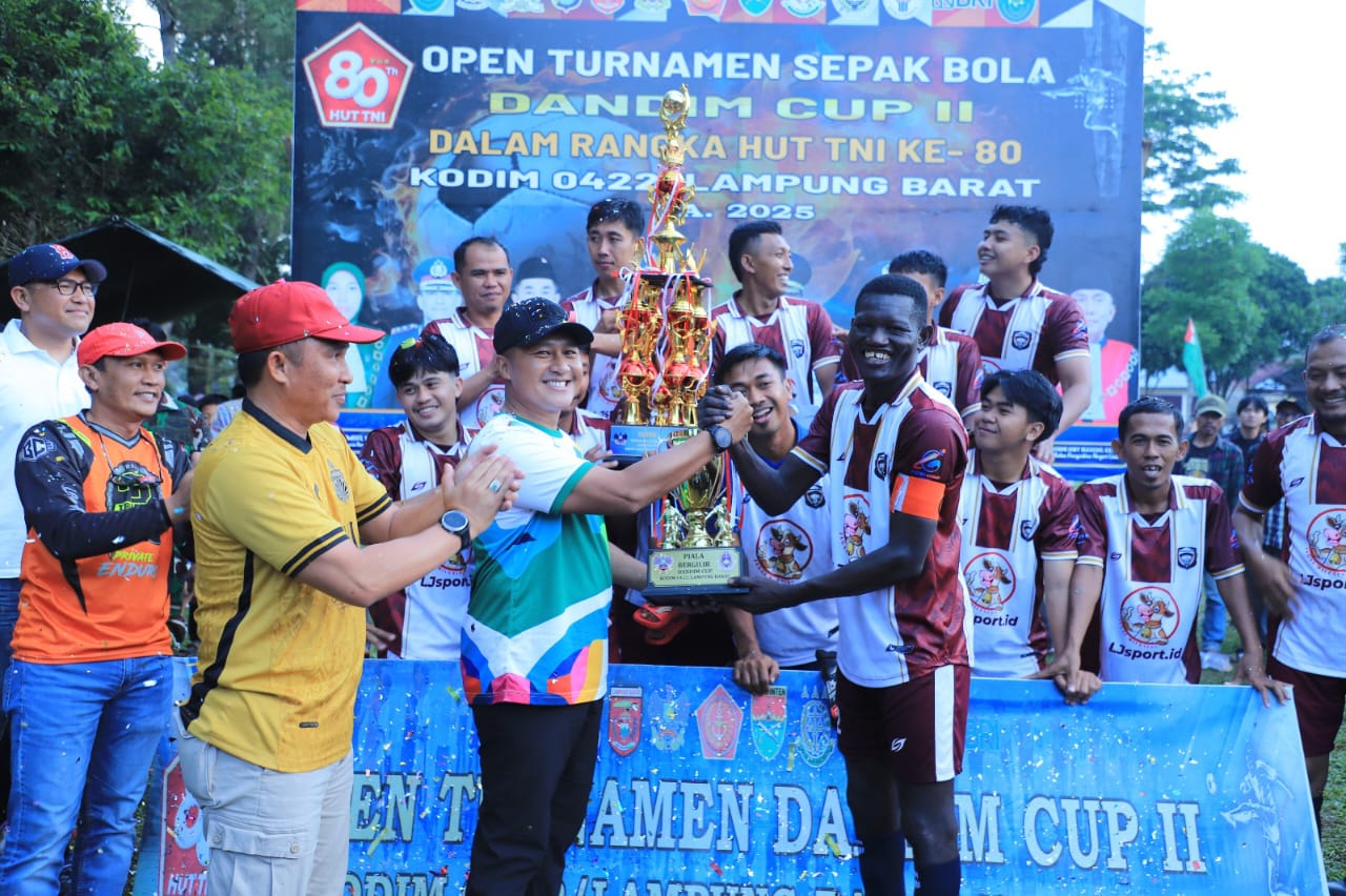 BUMI CENDERAWASIH.ID – Turnamen sepak bola Dandim Cup Tahun 2025, resmi ditutup Bupati Lampung Barat Parosil Mabsus di lapangan Indrapati Cakra Negera, Kecamatan Balik Bukit, Jum’at 10 Oktober 2025.